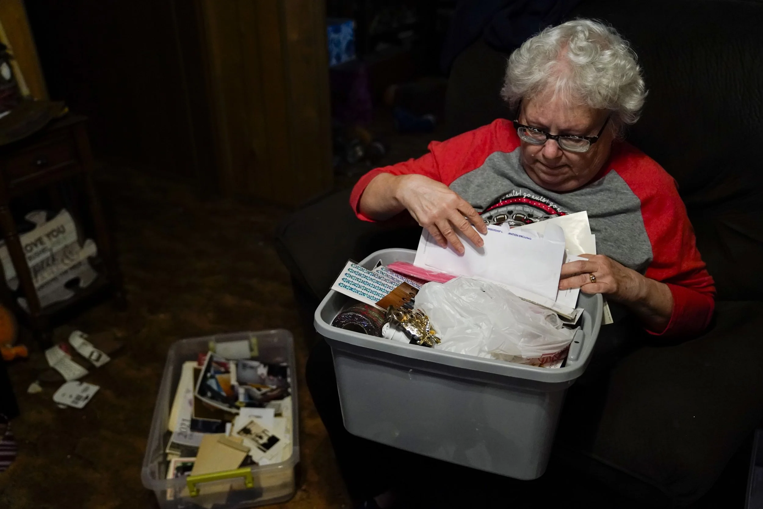 Debbie Steeb, a 3rd generation East Palestine resident, sorts through personal items as she prepares to move out of her family home on Saturday, April 1, 2023, in East Palestine, Ohio. Ms. Steeb was looking for her will and tax documents.